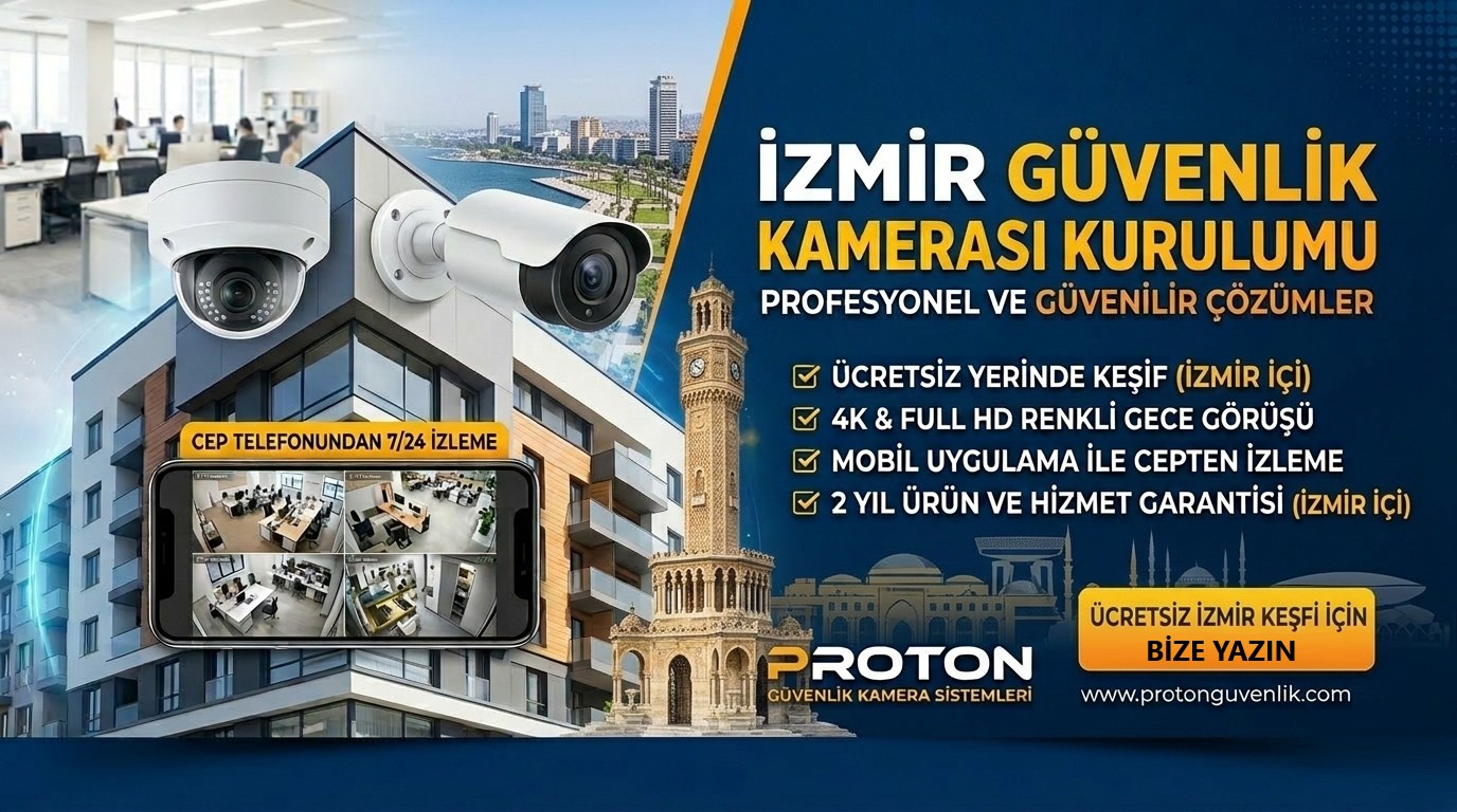 Türkiye’nin en dinamik ve hızlı gelişen şehirlerinden biri olan İzmir’de, evinizin, iş yerinizin veya mülkünüzün güvenliği her şeyden önce gelir. Proton Güvenlik Kamera Sistemleri, profesyonel ekibi ve modern teknolojiyi birleştirerek, İzmir genelinde profesyonel güvenlik kamerası kurulum hizmeti sunmaktadır. İzmir’deki sevdiklerinizi ve mal varlığınızı Proton’un güvenli kanatları altına alın.