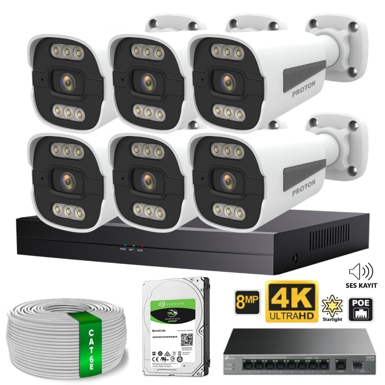 Proton 6 Kameralı Mikrofonlu Sesli 4K POE IP Kamera Seti